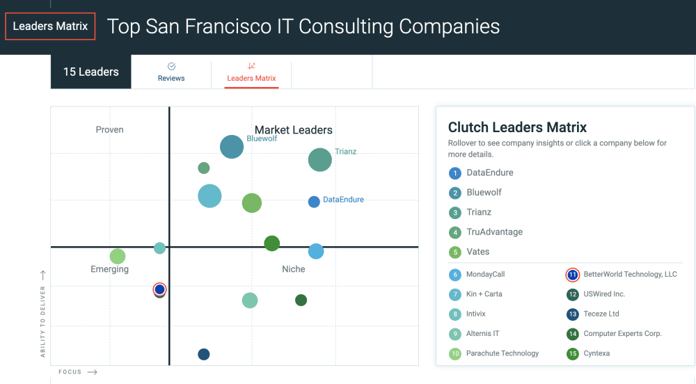 We are pleased with our recognition by Clutch as one of the top managed service providers in San Francisco. BetterWorld Technology has made it into Clutch’s Leader’s Matrix – a compilation of the top managed service providers in San Francisco.